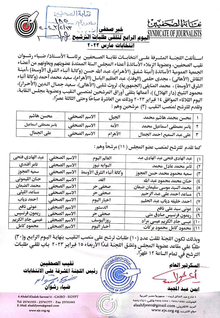 استأنفت اللجنة المشرفة على انتخابات نقابة الصحفيين برئاسة ضياء رشوان نقيب الصحفيين، وعضوية أعضاء المجلس الستة الممتدة عضويتهم، أعمالها بتلقي أوراق المرشحين لمنصبي النقيب وعضوية مجلس النقابة، اليوم الثلاثاء الموافق 14 فبراير 2023 وذلك من العاشرة صباحًا وحتى الثالثة عصرًا.
