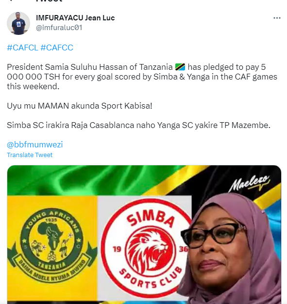 وأوضحت إذاعة "B&B" التنزانية أن الرئيسة أعلنت عن قرارها بمكافأة ناديي سيمبا ويانج أفريكانز على تسجيل الأهداف في عصبة الأبطال وكأس الكونفدرالية، وتبلغ قيمة التحفيز عن كل هدف مسجل 5 ملايين شيلينج تنزاني أي ما يعادل(65 ألف جنيه مصري).