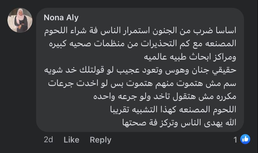 وعلقت أخرى، جنون استمرار الناس في شراء اللحوم المصنعة مع كم التحذيرات من منظمة الصحة ومراكز الأبحاث الطبية العالمية، حقيقي هوس وجنان وتعود عجيب.. لو قولتلك خد شوية سم مش هتموت منهم هتموت بس لو أخذت جرعات مكررة، اللحوم المصنعة نفس التشبيه تقريبًا.. الله يهدي الناس وتركز في صحتها.