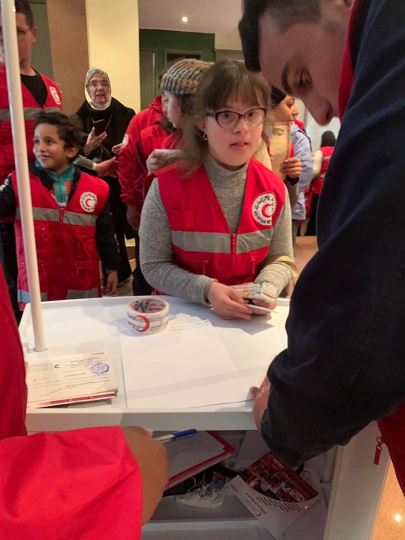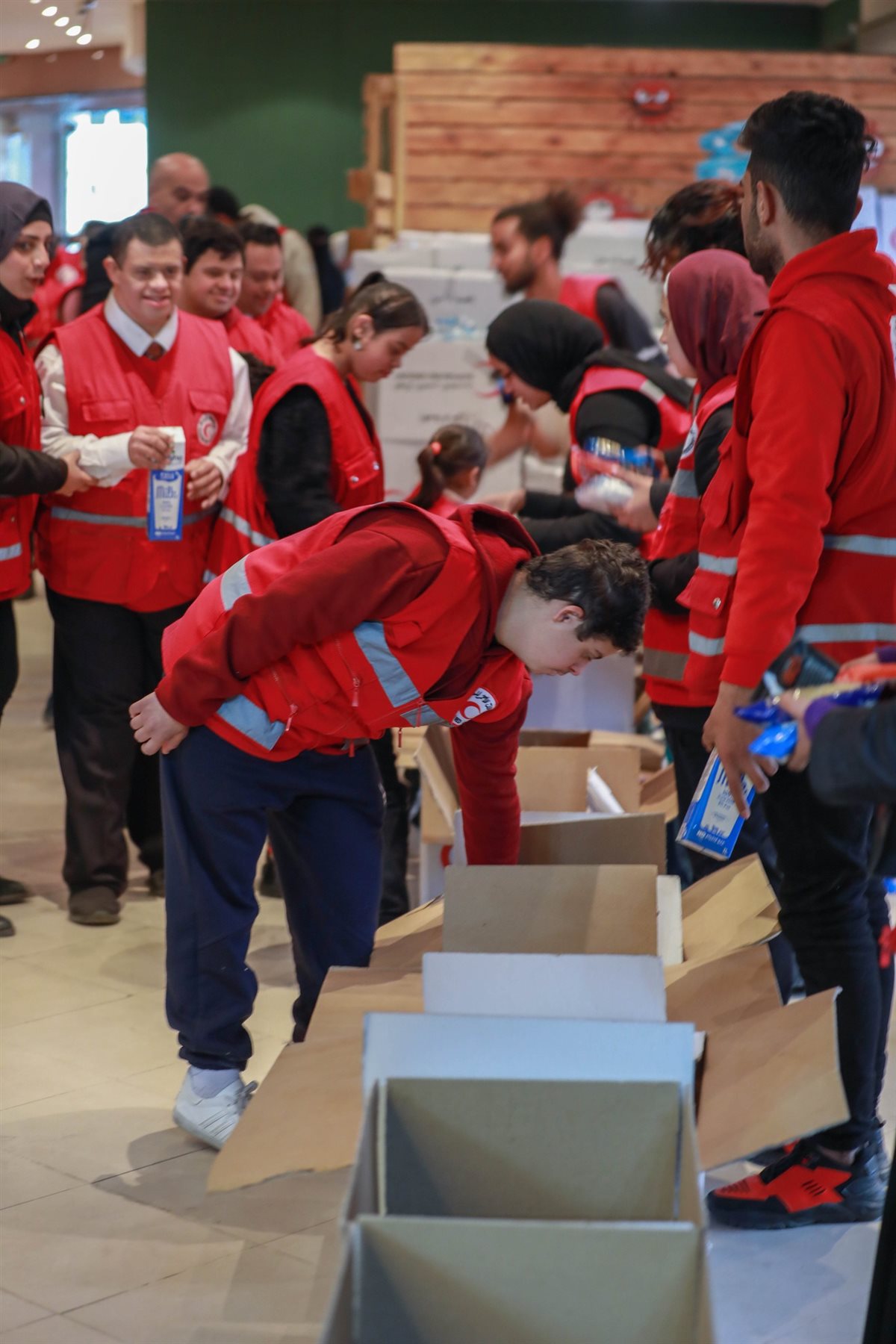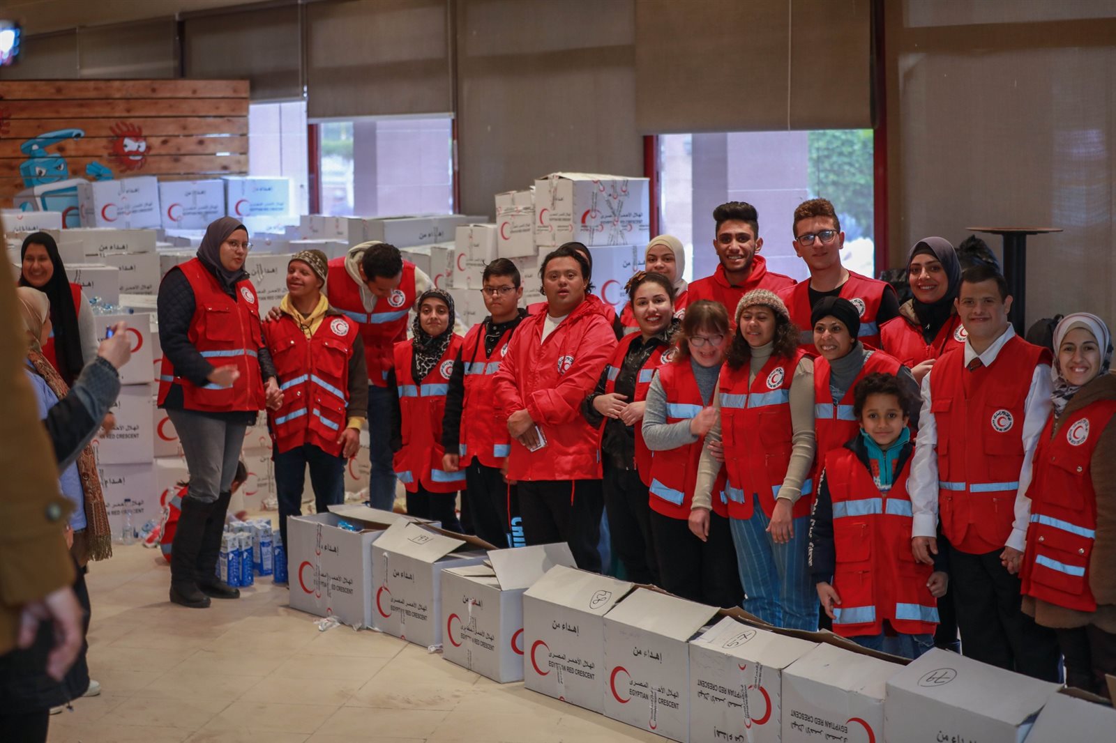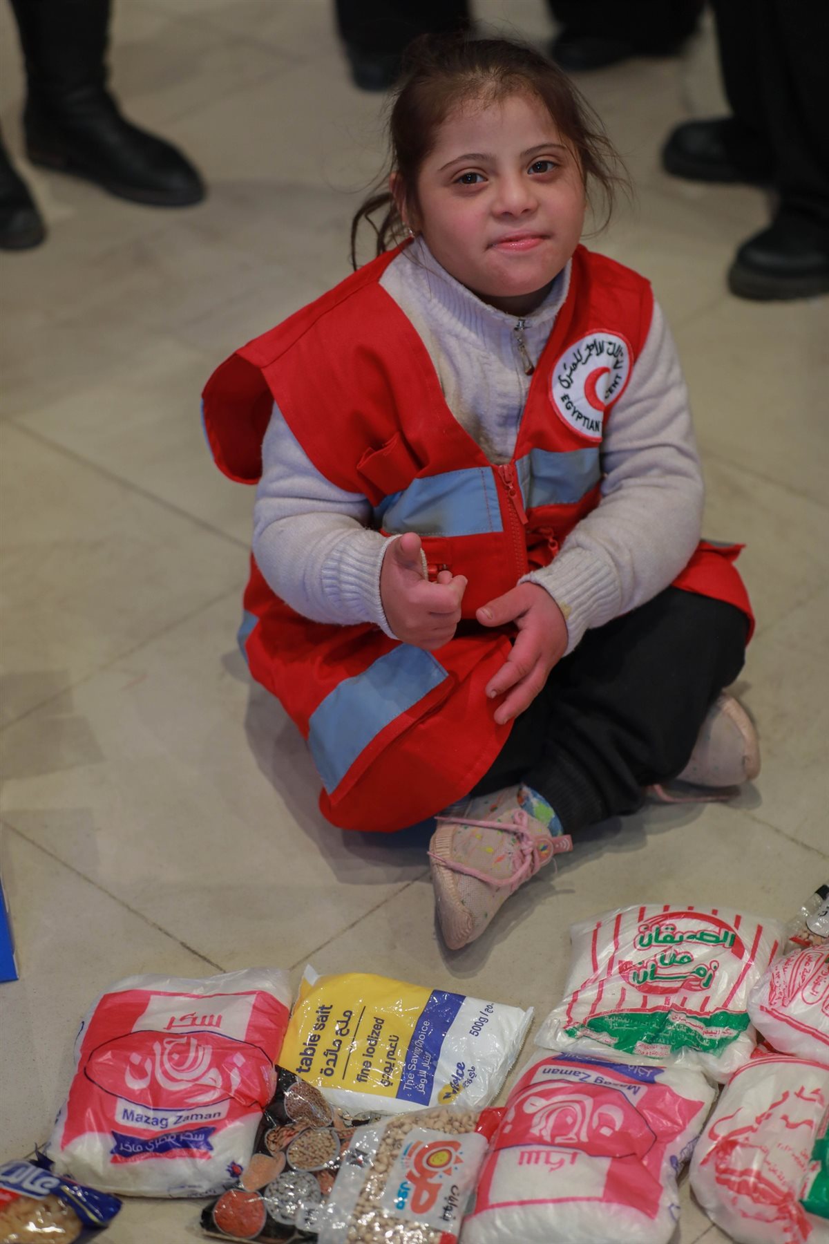 الهلال الأحمر: أطفال من ذوي الهمم يشاركون في تعبئة المواد الإغاثية لإرسالها إلى سوريا | صور