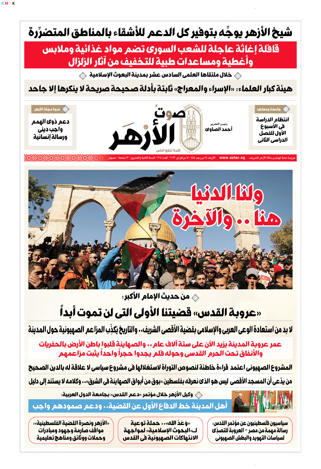أبرزت جريدة صوت الأزهر، الناطقة باسم الأزهر الشريف، توجيه الإمام الأكبر الدكتور أحمد الطيب، شيخ الأزهر الشريف، بتوفير كل الدعم للأشقاء بالمناطق المتضرّرة، كما سطلت الضوء على قافلة الإغاثة العاجلة للشعب السوري التي تضم مواد غذائية وملابس وأغطية ومساعدات طبية للتخفيف من آثار الزلزال.