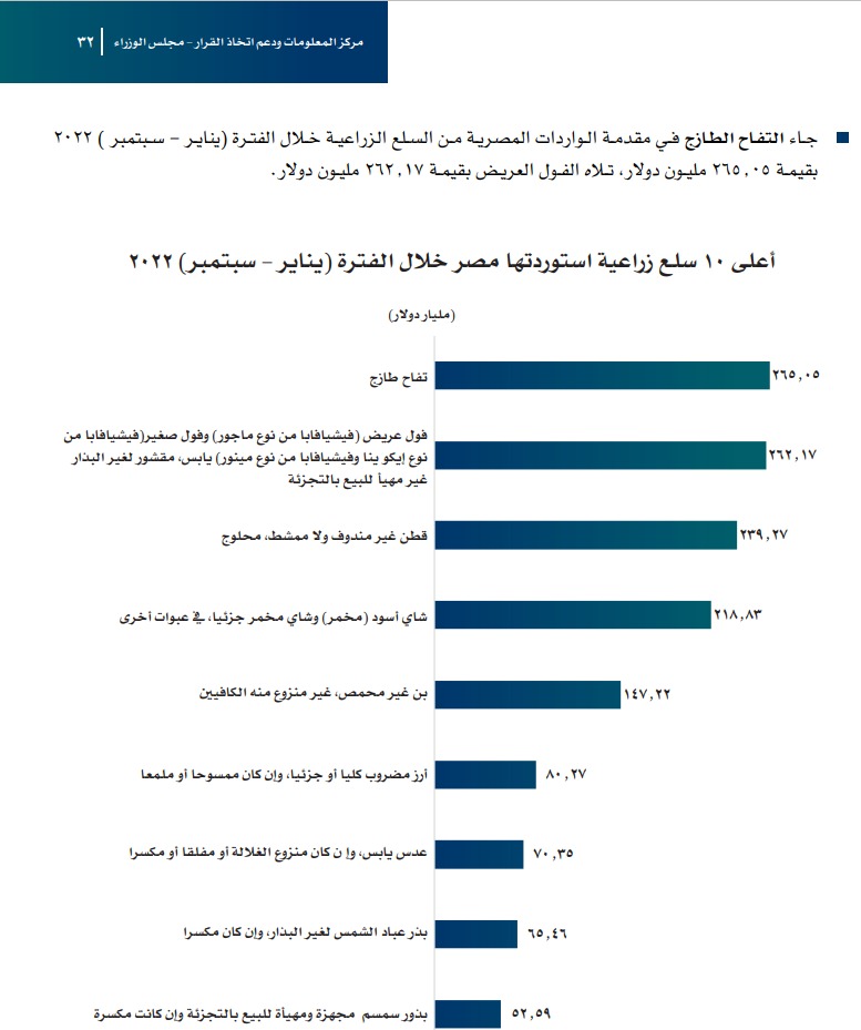 واستعرضت الوثيقة أعلى 10 سلع زراعية استوردتها مصر خلال الفترة من يناير إلى سبتمبر 2022، حيث جاء التفاح الطازج في مقدمة الواردات المصرية من السلع الزراعية خلال تلك الفترة بقيمة 265.05 مليون دولار، تلاه الفول العريض بقيمة 262.17 مليون دولار.