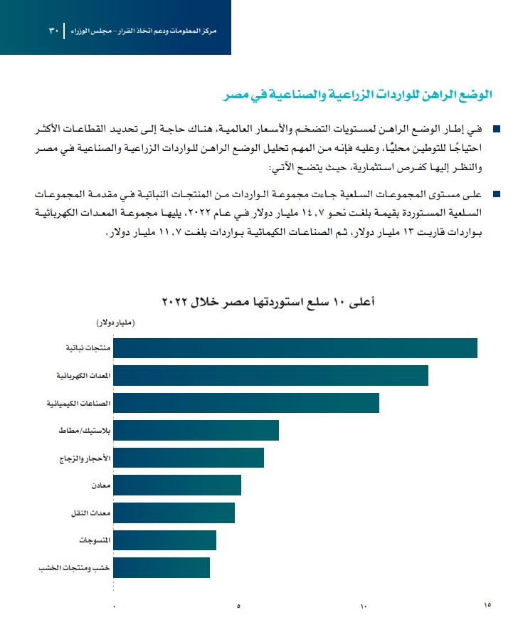 وفي إطار الوضع الراهن لمستويات التضخم والأسعار العالمية، أشارت الوثيقة إلى أن هناك حاجة إلى تحديد القطاعات الأكثر احتياجا للتوطين محليا، وعليه فإنه من المهم تحليل الوضع الراهن للواردات الزراعية والصناعية في مصر والنظر إليها كفرص استثمارية، حيث يتضح الآتي:
