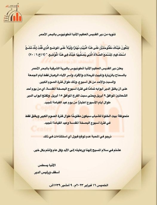 وقال دير الأنبا أنطونيوس بالبحر الأحمر في بيان له اليوم الخميس: يعلن دير القديس العظيم الأنبا أنطونيوس بالبرية الشرقية بالبحر الأحمر بالسماح بالزيارة والمبيت للرحلات والأفراد وأسر الآباء الرهبان فقط أيام الجمعة والسبت والأحد من كل أسبوع، وذلك طوال فترة الصوم الكبير، على أن يغلق الدير أبوابه تمامًا في فترة أسبوع البصخة المقدسة، أي من يوم أحد الشعانين الموافق 9 إبريل وحتى سبت الفرح الموافق 15 إبريل وتفتح أبواب الدير طوال أيام الأسبوع اعتبارا من يوم عيد القيامة المجيد.