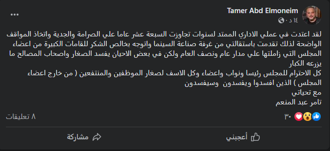 ونشر تامر عبد المنعم عبر حسابه الشخصي على موقع فيس بوك، منشور يعلن من خلاله عن استقالته من المنصب، إذ علق: لقد اعتدت في عملي الإداري الممتد لسنوات تجاوزت السبعة عشر عاما على الصرامة والجدية واتخاذ المواقف الواضحة.