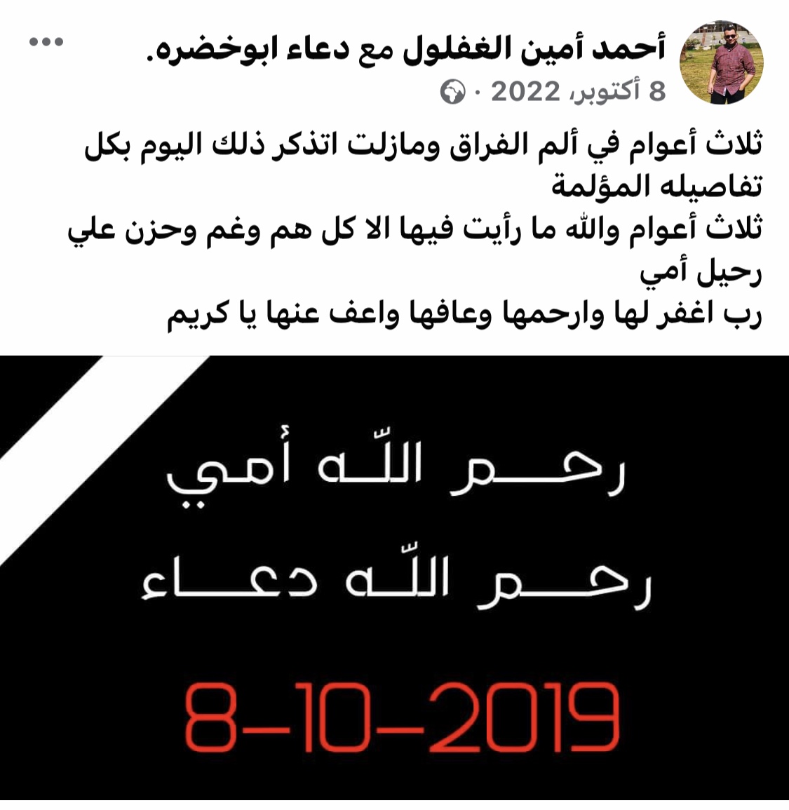 وأضاف: في الذكرى الأخيرة لوفاة والدته التي أوصتنا عليه قبيل رحيلها بلحظات، كتب أحمد لها رسالة، شعرنا جميعا بغصة مرارتها: 3 أعوام في ألم الفراق، 3 أعوام والله ما رأيت فيها إلّا كل هم وغم وحزن على رحيل أمي.. الآن يا بنيّ لن تطول لوعة الفراق، ولن يحاصرك الشوق والحنين، فكما يقولون: في الفردوس، عناق طويل وقرب أبدي وحب خالد.