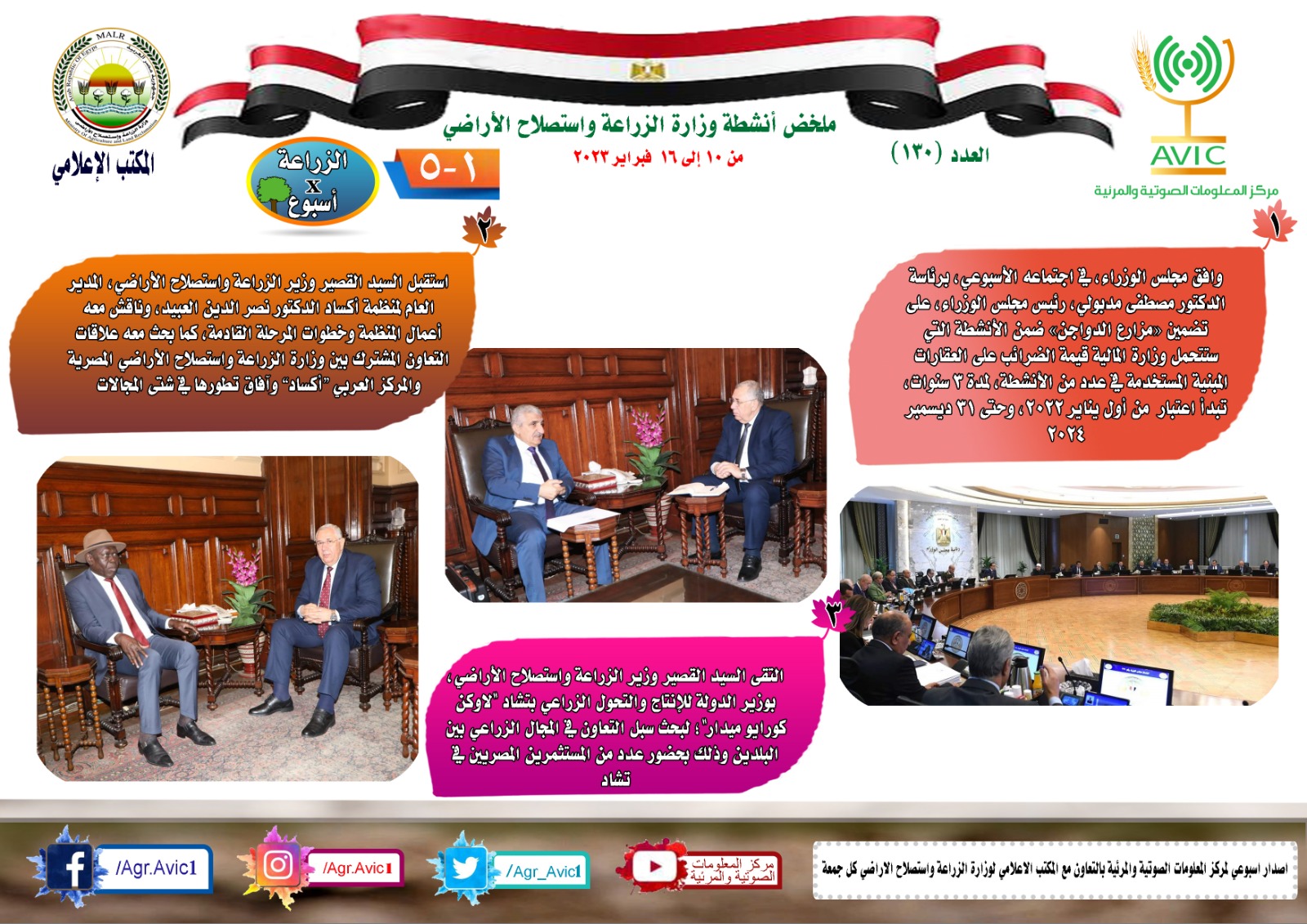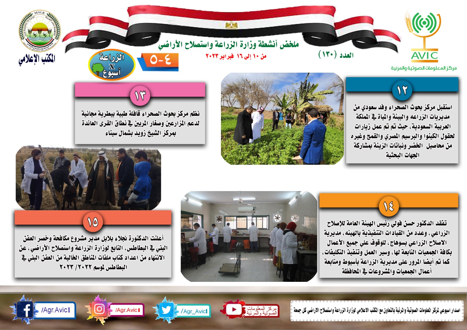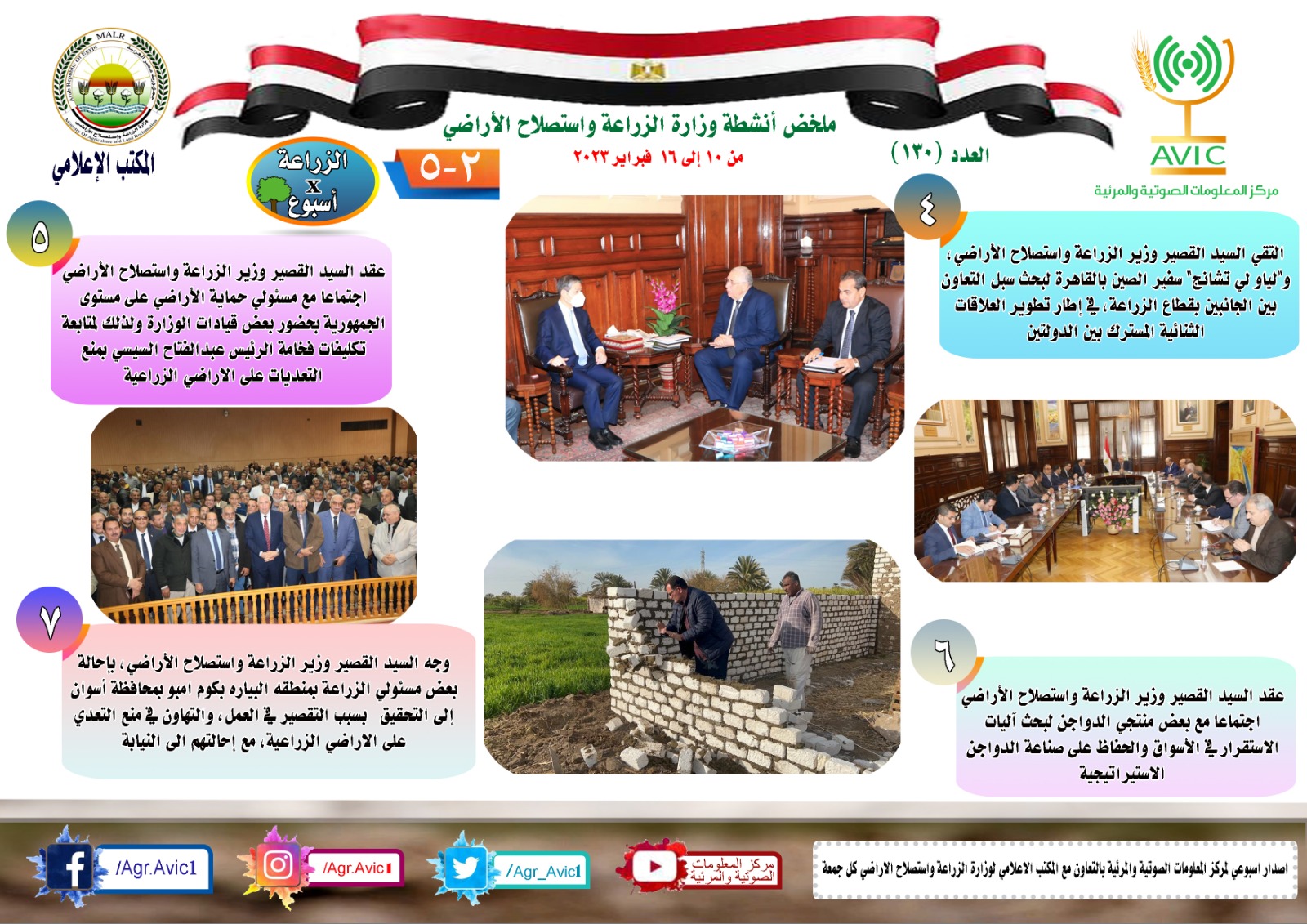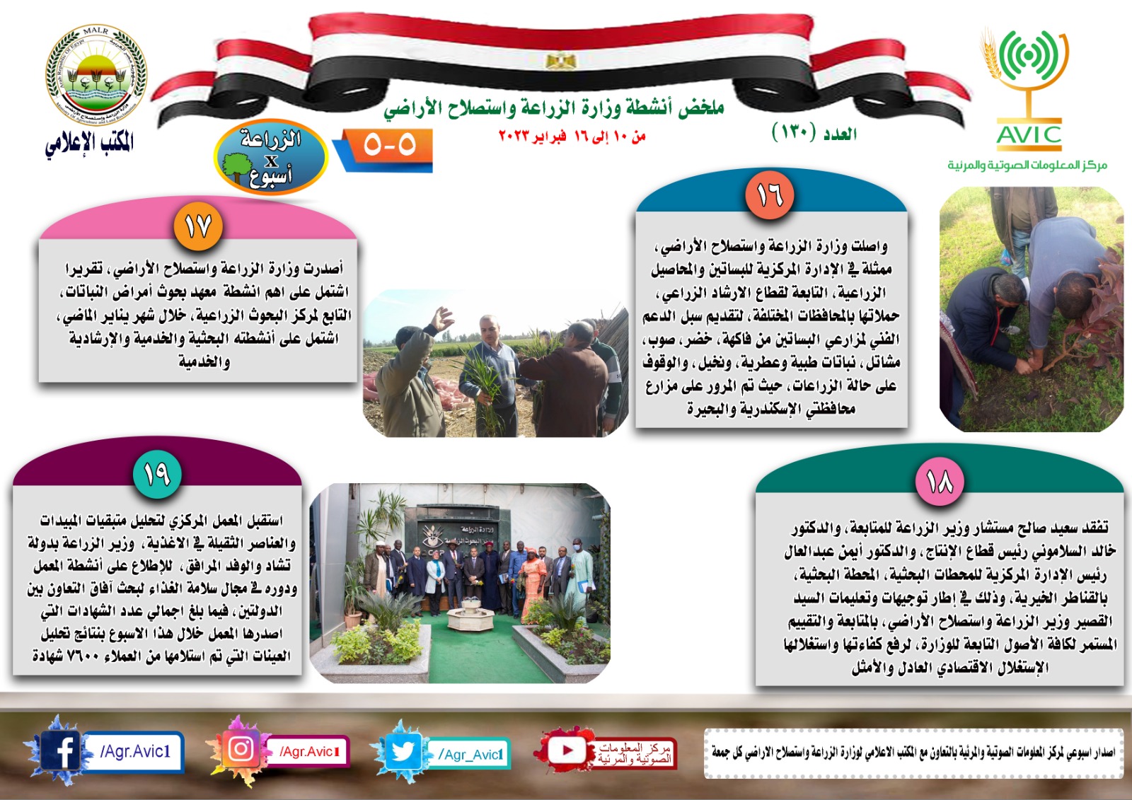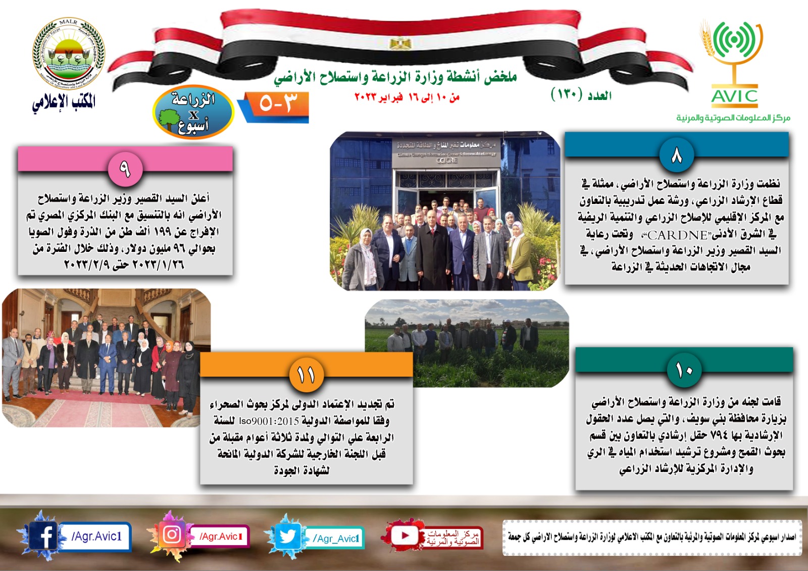 أصدر مركز المعلومات الصوتية والمرئية، التابع لوزارة الزراعة واستصلاح الأراضي، "الانفوجراف الأسبوعي" في نسخته رقم 130، حول الحصاد الأسبوعي لأهم أنشطة الوزارة، خلال الأسبوع الماضي في الفترة من 10 وحتى 16 فبراير الجاري، وذلك بالتعاون مع المكتب الاعلامي للوزارة.