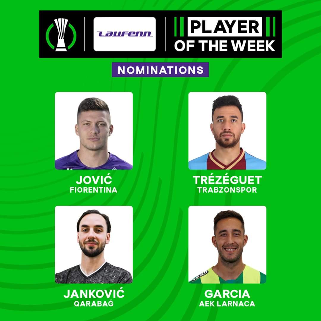 وشهدت قائمة المرشحين لحصد جائزة أفضل لاعب في ذهاب ملحق دور الستة عشر من عمر بطولة دوري المؤتمر الأوروبي، تواجد الدولي المصري محمود حسن تريزيجيه لاعب طرابزون سبور، رفقة كل من لوكا يوفيتش لاعب فيورنتينا الإيطالي، وأنخيل جارسيا لاعب آيك لارنكا، بالإضافة إلى يانكوفيتش لاعب كارباج أغدام.