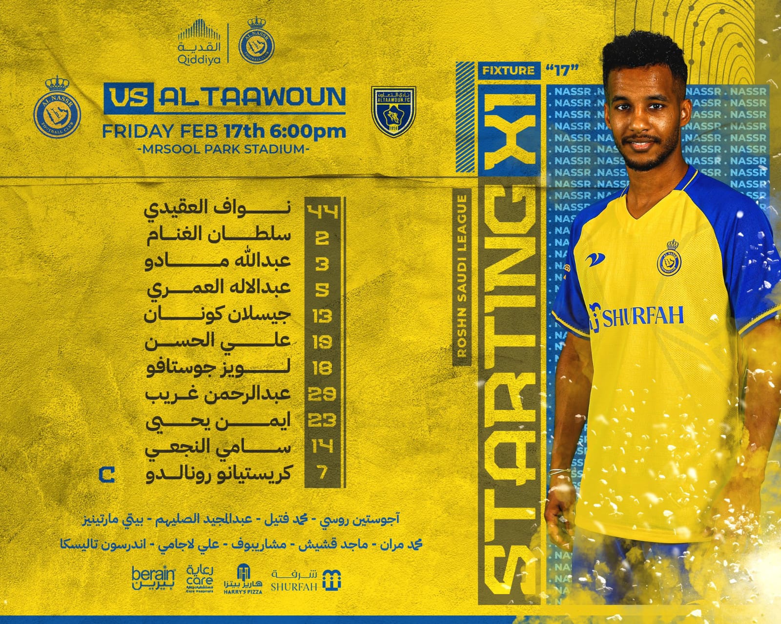 وشهد تشكيل النصر أمام نظيره فريق التعاون، تواجد البرتغالي كريستيانو رونالدو في خط الهجوم، بجانب عبد الرحمن غريب.