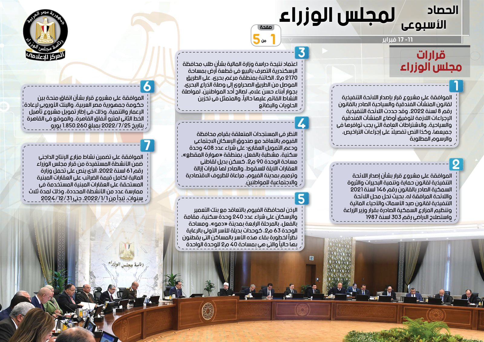نشر المركز الإعلامي لمجلس الوزراء، تقريرًا شمل إنفوجرافات سلط من خلالها الضوء على الحصاد الأسبوعي لمجلس الوزراء، وذلك خلال الفترة من 11 حتى 17 فبراير 2023، والذي تضمن الموافقة على عدد من القرارات، فضلًا عن الاجتماعات واللقاءات التي عقدها الدكتور مصطفى مدبولي، رئيس مجلس الوزراء، بالإضافة إلى ما أجراه من أنشطة.