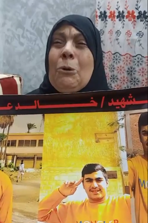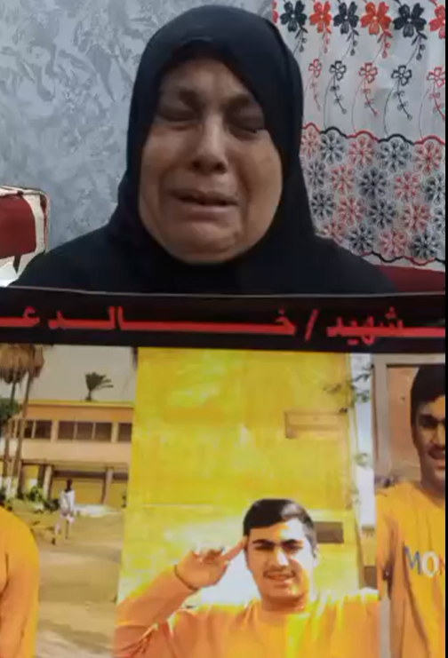 ووصلت الأم إلى المستشفى ونظرت إلى ابنها والدموع تنهمر من عينيها لا تستطيع إيقافها وهي ترى ابنها يجلس داخل الغرفة سائحا في دمائه وقلبها يرتجف ألمًا عليه، وتحاول الحديث معه قائلة: قوم يا خالد جرالك أي يا ابني ما أنت كنت كويس ليه عملوا فيك كده؟ لكنها لا تجد إجابة من ابنها الذي فارق الحياة متأثرًا بطعنة من صديقه أودت بحياته.