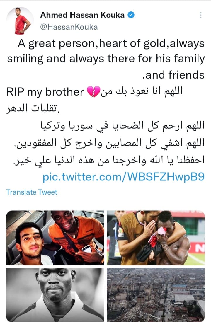 نعى أحمد حسن كوكا نجم منتخب مصر والمحترف في صفوف فريق ألانيا سبور التركي، اللاعب الغاني كريستيان أتسو لاعب فريق هاتاي سبور، والذي لقي حتفه إثر الزلزال المدمر الذي ضرب تركيا في الأسابيع الماضية.