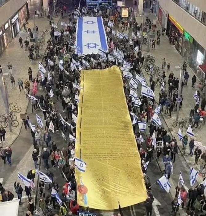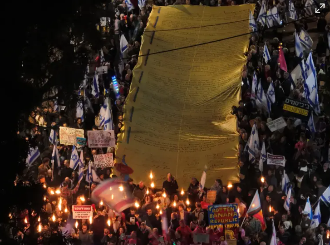 وقال منظمو الاحتجاجات: نحن أمام نقطة اللاعودة، إن إسرائيل على بعد خطوة واحدة من أن تصبح دولة ديكتاتورية والمحطة الوحيدة المتبقية هي حشد المواطنين لينزلوا إلى الشوارع.