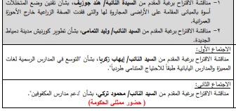 كما تناقش اللجنة أيضًٍا الاقتراح برغبة المقدم من إيهاب زكريا، بشأن التوسع في المدارس الرسمية لغات المميزة والمدارس اليابانية طبقًا للاحتياج المتنامي طرديًا، فضًلا عن الاجتماع الثاني المخصص لمناقشة الاقتراح برغبة المقدم من السيد النائب محمود تركي، بشأن دعم مدارس المكفوفين، وذلك بحضور ممثلي الحكومة.