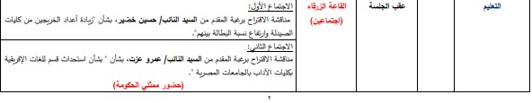 ومن المقرر أن تناقش لجنة التعليم والبحث العلمي في مجلس الشيوخ، الاقتراح برغبة المقدم من النائب حسين خضير بشأن زيادة أعداد الخريجين من كليات الصيدلة وارتفاع نسبة البطالة بينهم، فضًلا عن مناقشة الاقتراح برغبة المقدم من النائب عمرو عزت بشأن استحداث قسم للغات الإفريقية بكليات الآداب بالجامعات المصرية، وذلك بحضور ممثلي الحكومة.