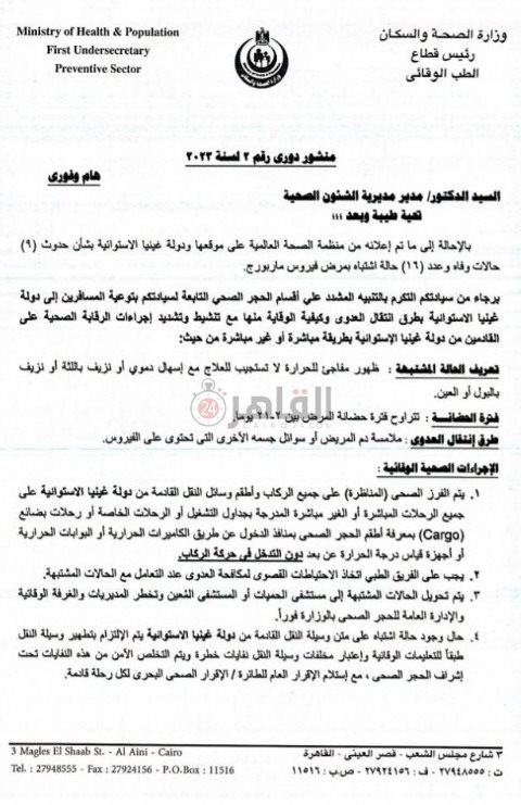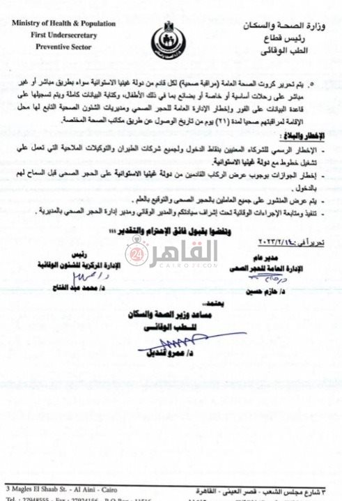 وأفاد منشور وزارة الصحة والسكان -حصل القاهرة 24 على نسخة منه- بأنه يجب على أقسام الحجر الصحي إخطار الجوازات بوجوب عرض الركاب القادمين من دولة غينيا الاستوائية على الحجر الصحي، قبل السماح لهم بدخول البلاد.