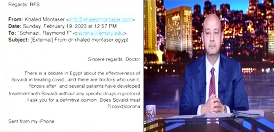 وعرض الدكتور خالد منتصر، خلال مداخلته إيميل من الطبيب مكتشف عقار سوفالدي والذي أكد خلاله أن عقار السوفالدي ليس له أي دور أو فاعلية في علاج كورونا، مضيفًا: ده الإيميل اللي اتبعت لي النهاردة من مخترع السوفالدي، بيقول فيه أن السوفالدي مالوش أي دور في علاج الكورونا، وأنه قال الكلام ده في بحث منشور قبل كده.