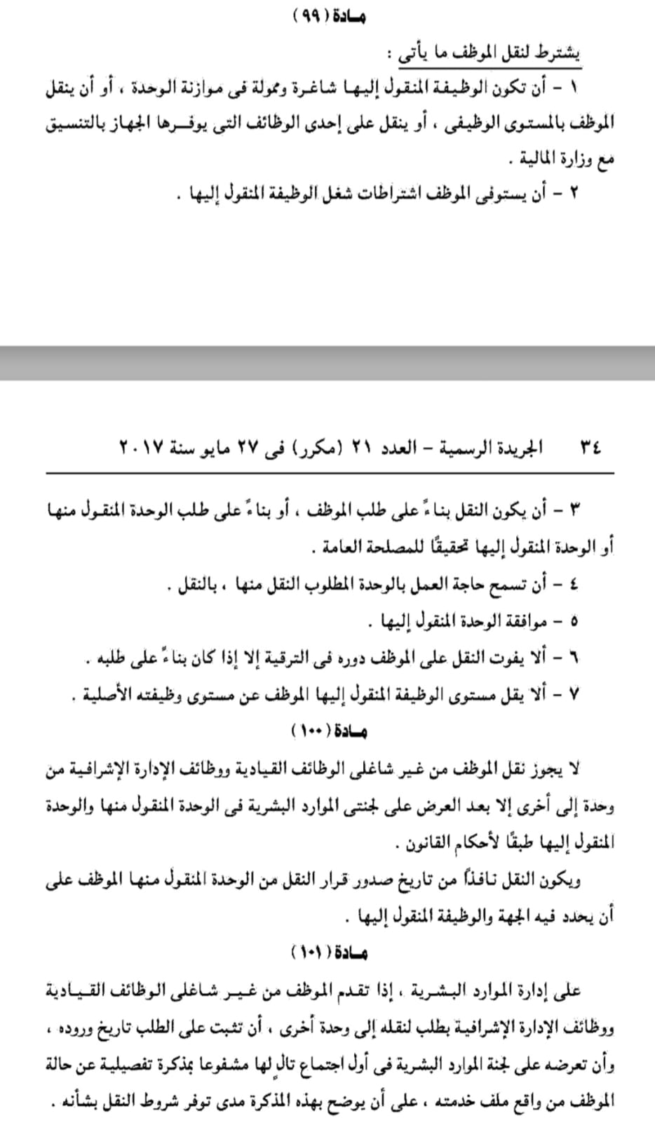 ووفقا للائحة التنفيذية لقانون الخدمة المدنية، حددت المادة رقم 99 من القانون شروط نقل الموظف، ونصت على أن تكون الوظيفة المنقول إليها الشخص شاغرة وممولة في موازنة الوحدة، أو ينقل بالمستوى الوظيفي.