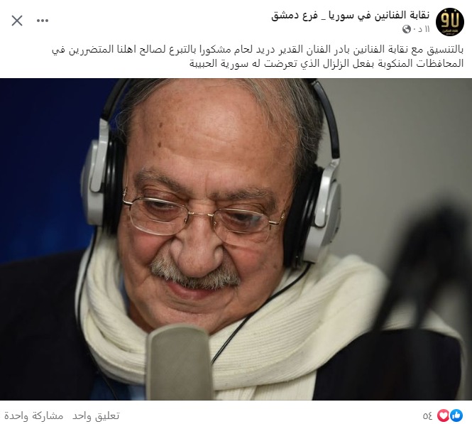 وكتبت نقابة الفنانين في سوريا، منشورًا عبر حسابه الشخصي بموقع التواصل الاجتماعي فيسبوك: بالتنسيق مع نقابة الفنانين، بادر الفنان القدير دريد لحام مشكورا بالتبرع لصالح أهلنا المتضررين في المحافظات المنكوبة بفعل الزلزال الذي تعرضت له سورية الحبيبة.