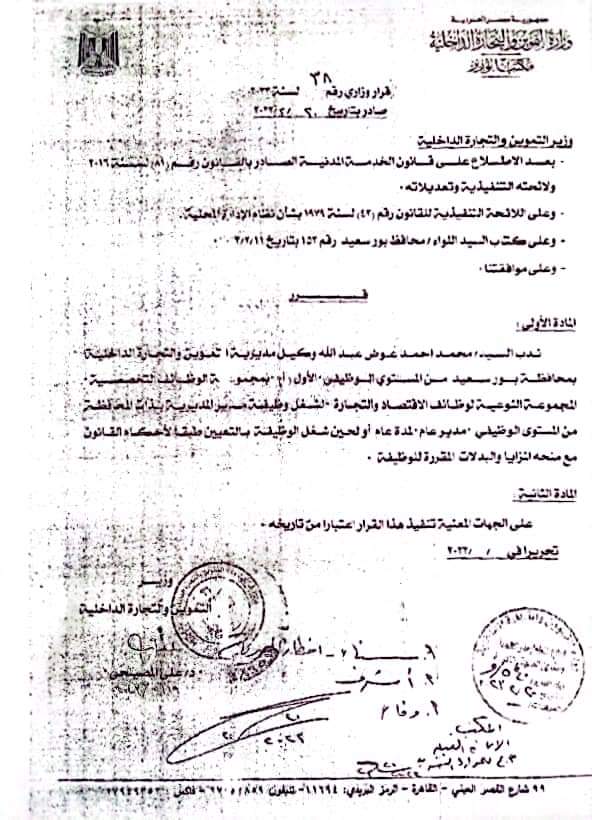 أصدر الدكتور علي المصيلحي وزير التموين والتجارة الداخلية، قرارًا بتعيين محمد عوض مديرًا عامًا لمديرية التموين والتجارة الداخلية بـ محافظة بورسعيد، وذلك لمدة عام كامل علn أن يتم مد العمل بالقرار، عقب انتهاء المدة المحددة.