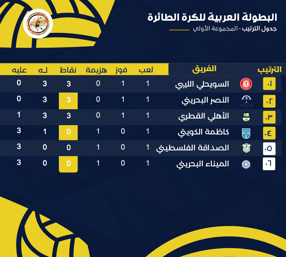 وعلى صعيد المجموعة الأولى بالبطولة العربية للكرة الطائرة للأندية، يتصدر فريق السويحلي الليبي المجموعة رفقة فرق النصر البحريني والأهلي والقطري ولكل منهم 3 نقاط.