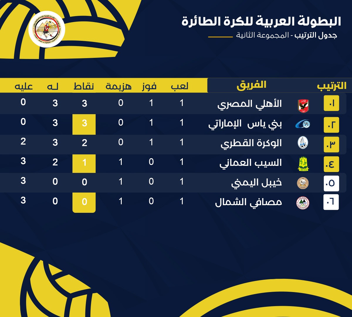 ترتيب مجموعة الأهلي بالبطولة العربية للكرة الطائرة