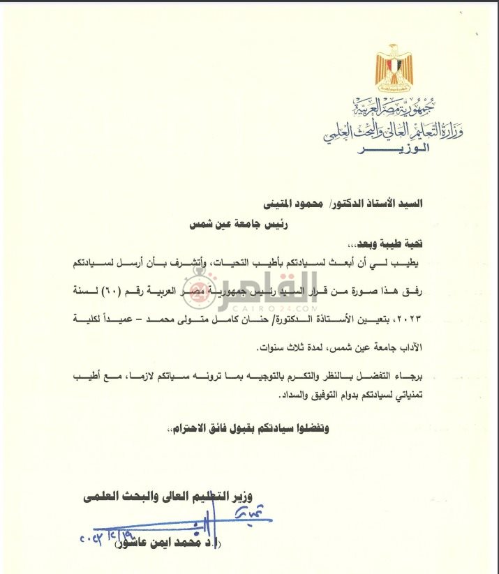 وخاطبت الدكتور أيمن عاشور وزير التعليم العالي والبحث العلمي، الدكتور محمود المتيني رئيس جامعة عين شمس، بالقرار الرئاسي الصادر بتعيين الدكتورة حنان كامل عميدا لكلية الآداب.