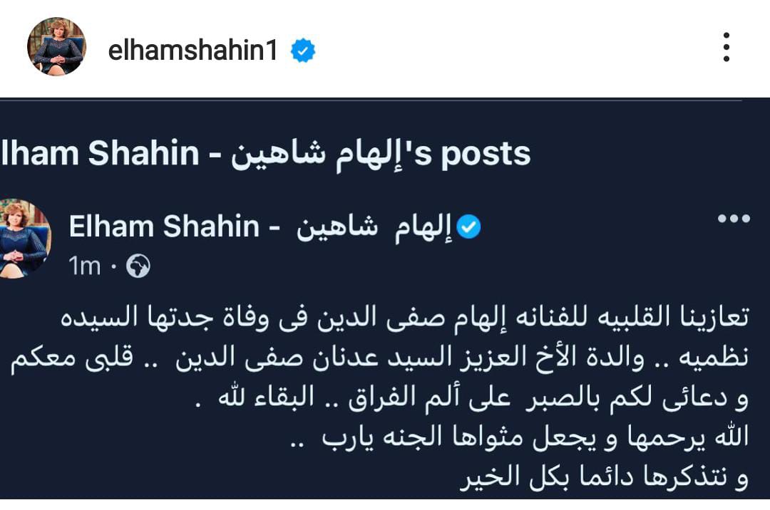وكتبت إلهام شاهين، منشورًا عبر حسابها الشخصي، بموقع فيس بوك جاء فيه: تعازينا القلبية للفنانة إلهام صفي الدين، في وفاة جدتها السيدة نظيمة، والدة الأخ العزيز السيد عدنان صفي الدين.