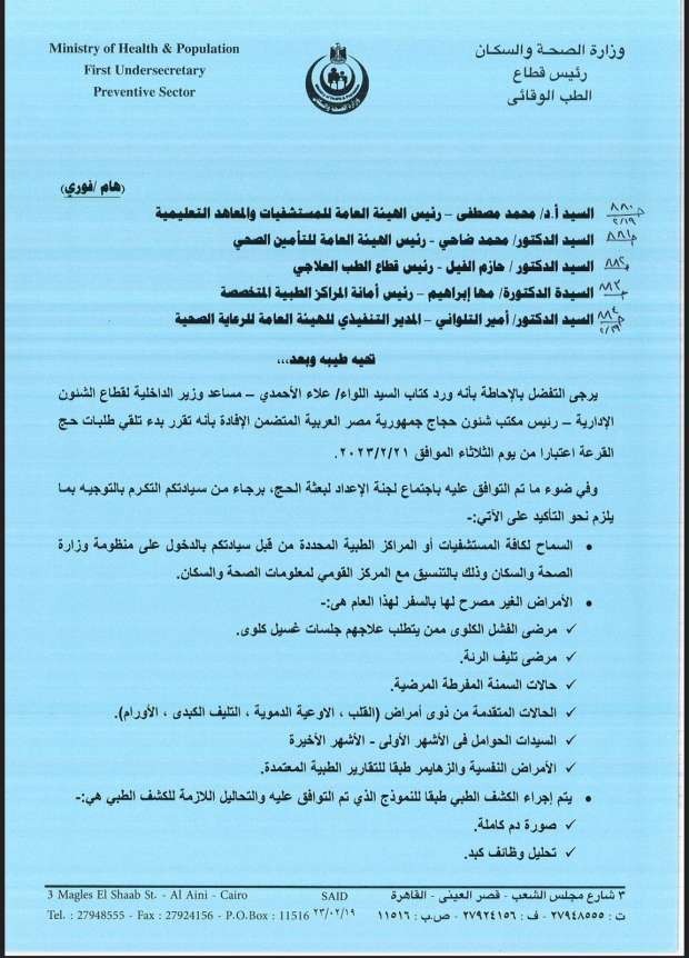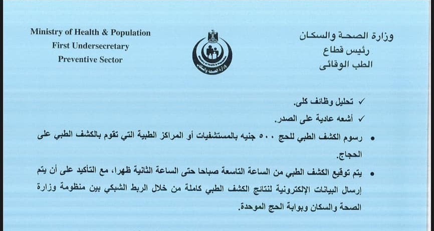 الصحة تكشف الأمراض غير المصرح لأصحابها بالحج.. و500 جنيه رسوم الكشف الطبي