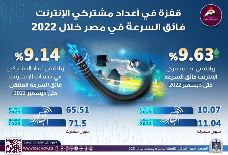 وبين أن الفترة الأخيرة شهدت قفزة في أعداد مشتركي الإنترنت فائق السرعة في مصر خلال 2022، حيث زاد عدد المشتركين حتى ديسمبر 2022، بنسبة 9.63%، فيما زاد أعداد المشتركين في خدمات الإنترنت المتنقل حتى ديسمبر 2022 بنسبة 9.14%.