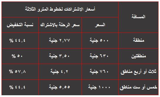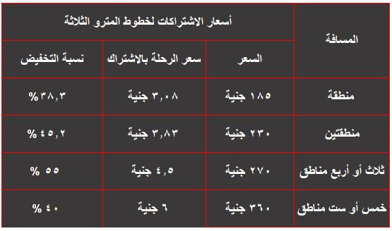 وتتكون تذكرة مترو الأنفاق العادية من 3 فئات، الفئة الأولى التذكرة الصفراء بخمس جنيهات في حدود 9 محطات فأقل، والفئة الثانية التذكرة الخضراء بسبعة جنيهات في حدود 16 محطة فأقل، والفئة الثالثة بـ10 جنيهات والتي كانت مفتوحة والحد الأقصى لسعر التذكرة، قبل أن تعلن وزارة النقل اليوم ارتفاع سعر تذكرة المترو لـ 12 جنيهات حال استقلال الراكب أكثر من 25 محطة.