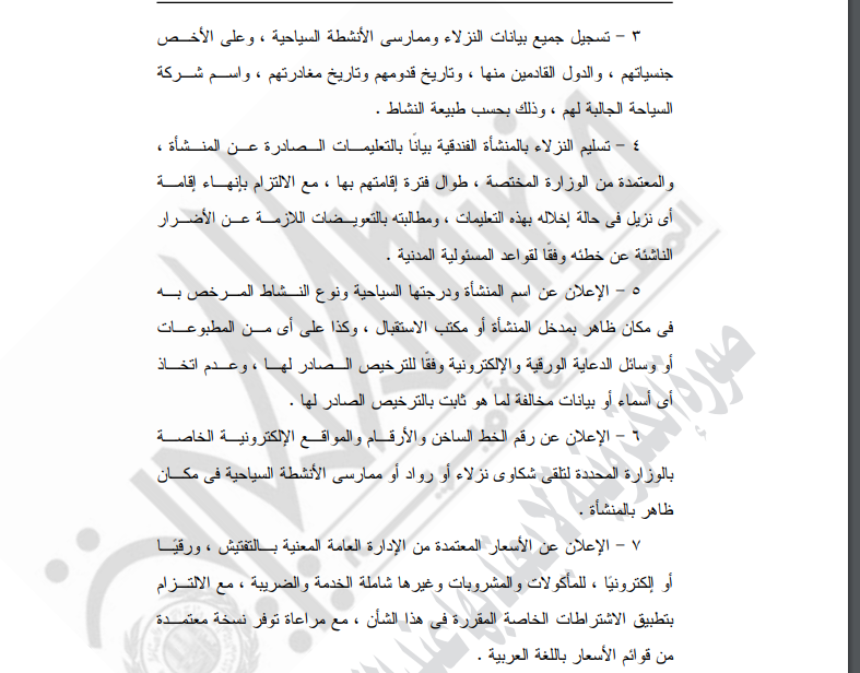 ألزم قانون إنشاء المنشآت السياحية والفندقية، الذي صدرت لائحته التنفيذية، مساء أمس، بتسجيل بيانات النزلاء وممارسي الأنشطة السياحية، وعلى الأخص جميع جنسياتهم، والدول القادمين منها، وتاريخ قدومهم وتاريخ مغادرتهم، واسم شركة السياحة الجالبة لهم، وذلك بحسب طبيعة النشاط.