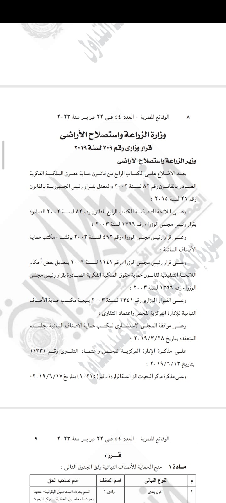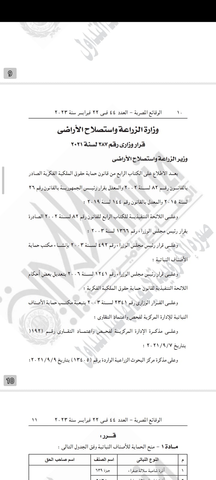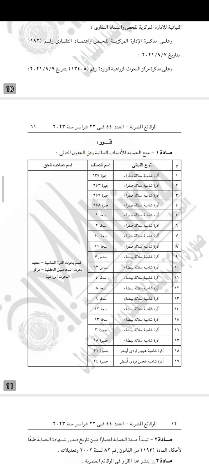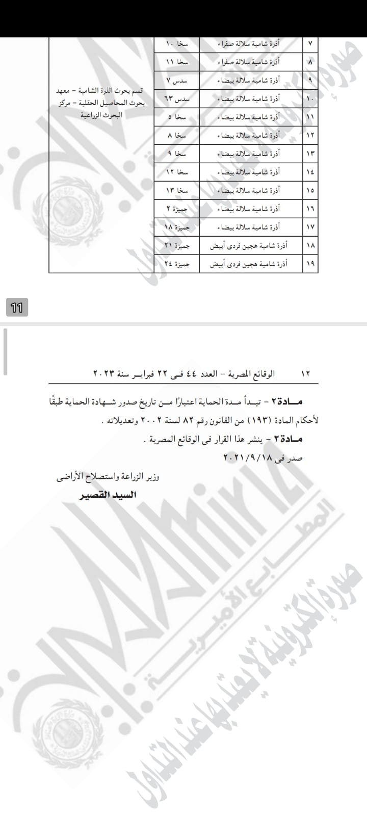وتابع القرار، أن الحمياة تأتي للأصناف في الجدول التي نشرته الجريدة، مؤكدا أن مدة الحماية تبدأ اعتبارا من تاريخ صدور شهادة الحماية طبقا لأحكام المادة 193 من القانون رقم 82 لسنة 2002 وتعديلاته.