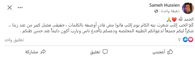 وكتب سامح حسين منشورًا، عبر حسابه الشخصي على موقع التواصل الاجتماعي فيسبوك، متمنيا أن يكون دائما عند حسن ظن الجميع، إذ قال: الحمد لله، كم الحب اللي شعرت بيه الكام يوم اللي فاتوا، مش قادر أوصفه بالكلمات، حقيقي فضل كبير من عند ربنا، شكرا ليكم جميعا لدعواتكم الطيبة ودعمكم يا أجدع ناس، ويارب أكون دائما عند حسن ظنكم.
