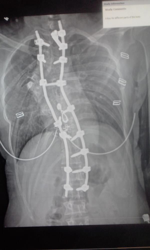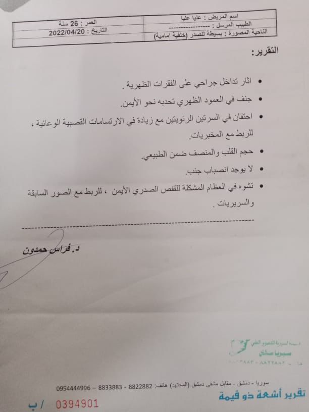 تعرضت فتاة سورية لحادث مأساوي، أصيبت على إثره بإصابات بالغة في العمود الفقري، حيث تعاني من جنف في العمود الظهري نحو الأيمن، والتحام في أجسام الفقرات الظهرية الخامسة والسادسة والسابعة، والتحامات في بعض الأضلاع اليمني.