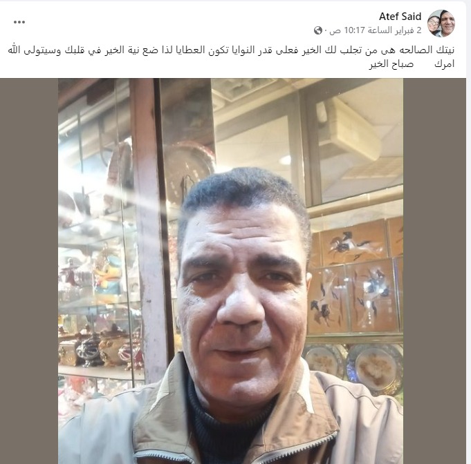 وكانت آخر كلمات عاطف سعيد، والتي كتبها عبر حسابه الشخصي بموقع التواصل الاجتماعي فيس بوك: نيتك الصالحة هي من تجلب لك الخير، فعلى قدر النوايا تكون العطايا لذا ضع نية الخير في قلبك وسيتولى الله أمرك.