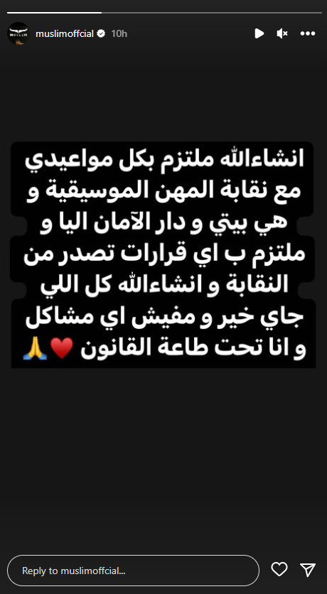 وكتب مسلم ستوري، عبر حسابه الشخصي بموقع تبادل الصور والفيديوهات القصيرة انستجرام، قال فيه: إن شاء الله ملتزم بكل مواعيدي مع نقابة المهن الموسيقية، هي بيتي ودار الأمان ليا، ومتلزم بأي قرارات تصدر من النقابة، وإن شاء الله كل اللي جاي خير، ومفيش أي مشاكل وأنا تحت طاعة القانون.
