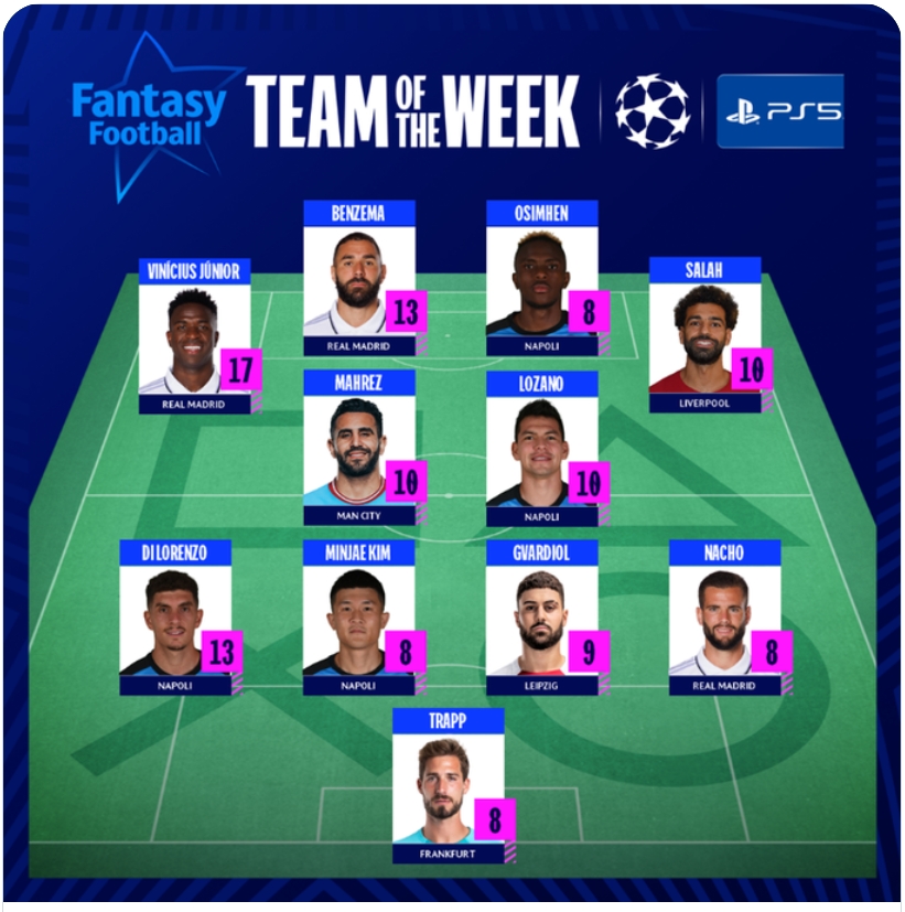 خط الهجوم: محمد صلاح (ليفربول)، كريم بنزيما (ريال مدريد)، فيكتور أوسمين (نابولي).