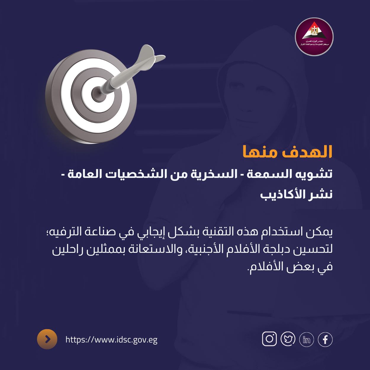 وتابع بأن: الهدف من التزييف يكون إما تشويه السمعة، السخرية من الشخصيات العامة، نشر الأكاذيب، لافتا إلى أنه يمكن استخدام هذه التقنية بشكل إيجابي في صناعة الترفيه لتحسين دبلجة الأفلام الأجنبية، والاستعانة بممثلين راحلين في بعض الأفلام.