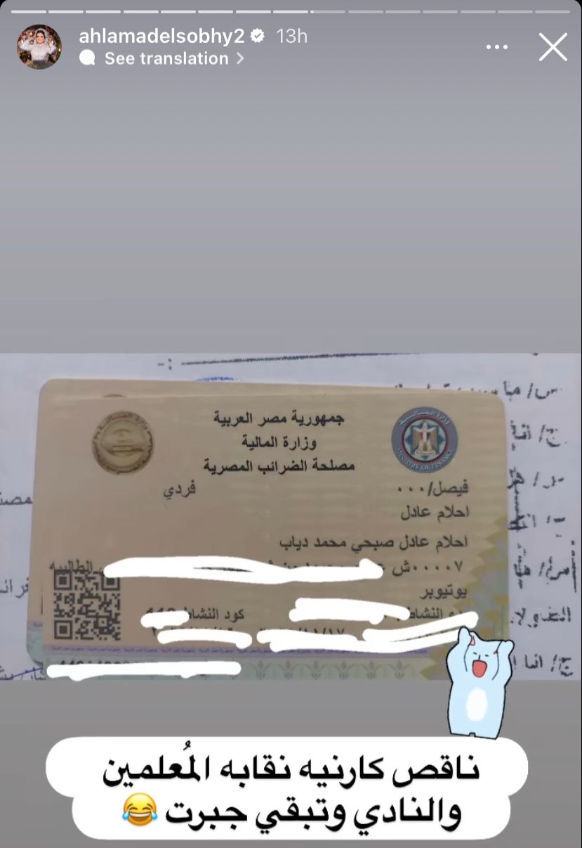 وأعلنت البلوجر أحلام عادل، خلال الساعات القليلة الماضية، عن حصولها على البطاقة الضريبية من وزارة المالية، حيث كتبت عبر خاصية ستوري بـ إنستجرام: ناقص كارنيه نقابة المعلمين والنادي وتبقى جبرت.