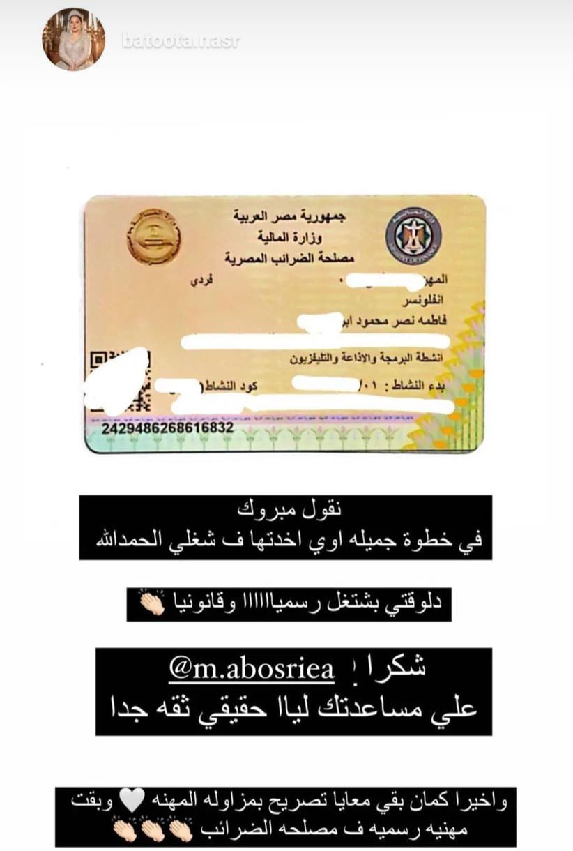 وقالت البلوجر بطوطة نصر: نقول مبروك خطوة جميلة أوي أخذتها في شغلي الحمد لله، دلوقتي بقيت بشتغل رسميًا وقانونيًا، وأخيرًا بقى معايا تصريح بمزاولة المهنة.. وبقيت مهنية رسمية ففي مصلحة الضرائب.