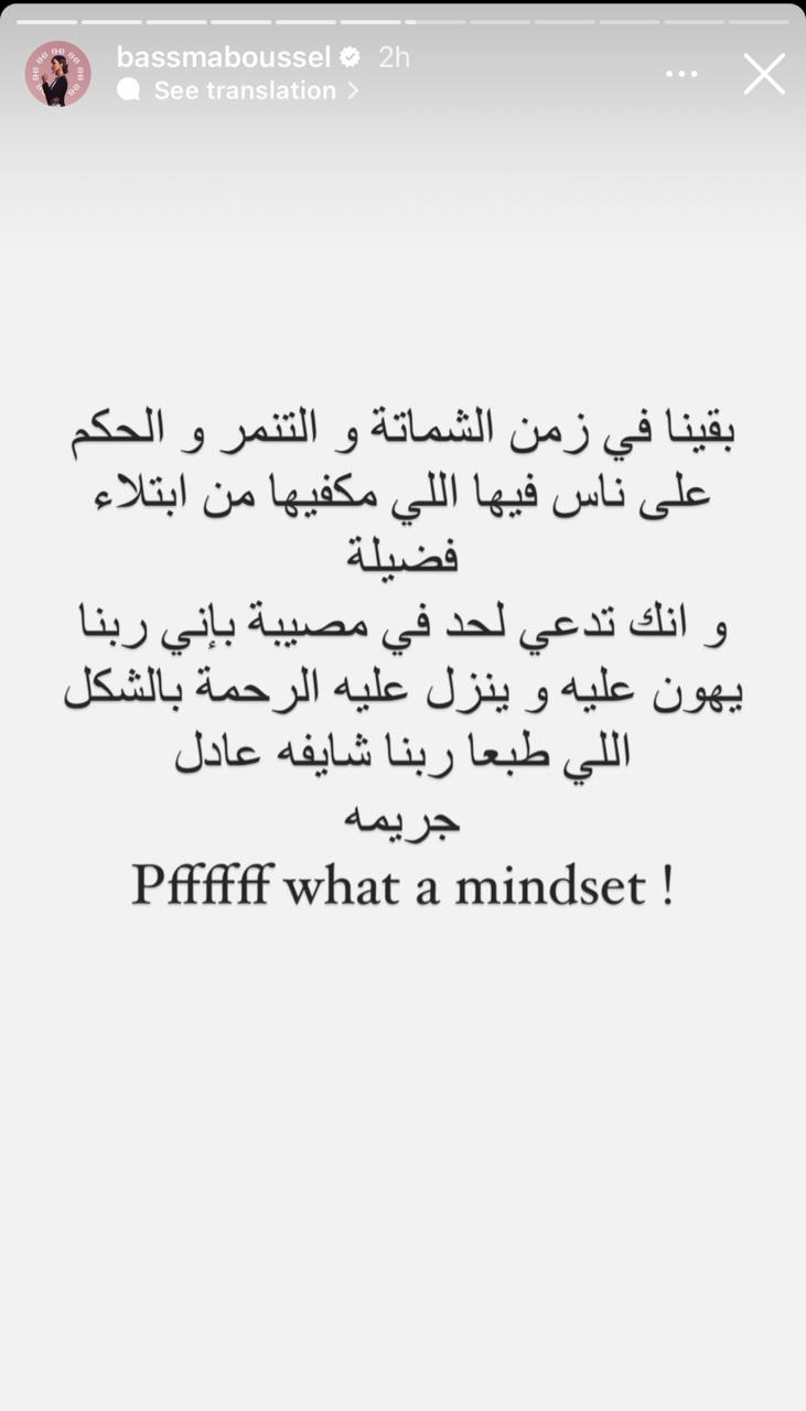 وكتبت بسمة بوسيل، منشورًا عبر خاصية ستوري على حسابها الشخصي بموقع تبادل الصور والفيديوهات القصيرة انستجرام: مساء الخير ردا على سوء التفاهم اللي حدث بسبب آخر ستوري مني، أنا أكيد ضد أي تحرش أو اغتصاب مهما كانت الظروف وما أقبلش على بناتي أو نفسي حاجة زي كده.