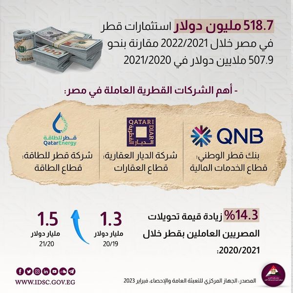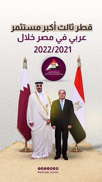 وحول تطور العلاقات المصرية القطرية، التي تأتي في ضوء زيادة الدكتور مصطفى مدبولي رئيس مجلس الوزراء، يسلط مركز المعلومات ودعم اتخاذ القرار التابع لمجلس الوزراء الضوء على حجم تطور العلاقات المصرية القطرية، إذ تعد قطر ثالث أكبر مستثمر عربي في مصر خلال 2021/ 2022، كما بلغت استثمارات قطر في مصر خلال 2021/ 2022 نحو 518.7 مليون دولار، مقارنة بـ 507.9 مليون دولار خلال 2020/ 2021.
