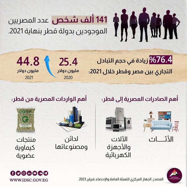 كما أشار إلى أن عدد المصريين الموجودين بدولة قطر بلغ نحو 141 ألف شخص بنهاية عام 2021، وتعد أهم الصادرات المصرية إلى قطر الأثاث والآلات والأجهزة الكهربائية.
