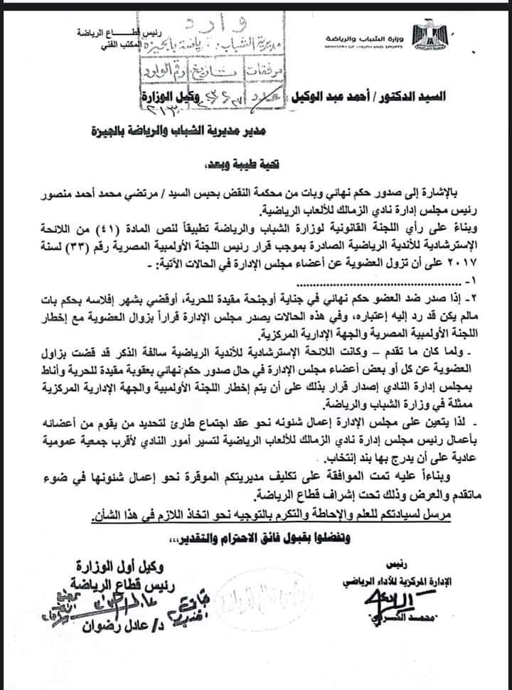 وحصل القاهرة 24، على خطاب وزارة الرياضة إلى مديرية الشباب والرياضة بالجيزة، وخطاب المديرية إلى نادي الزمالك، والذي جاء على النحو التالي:-
