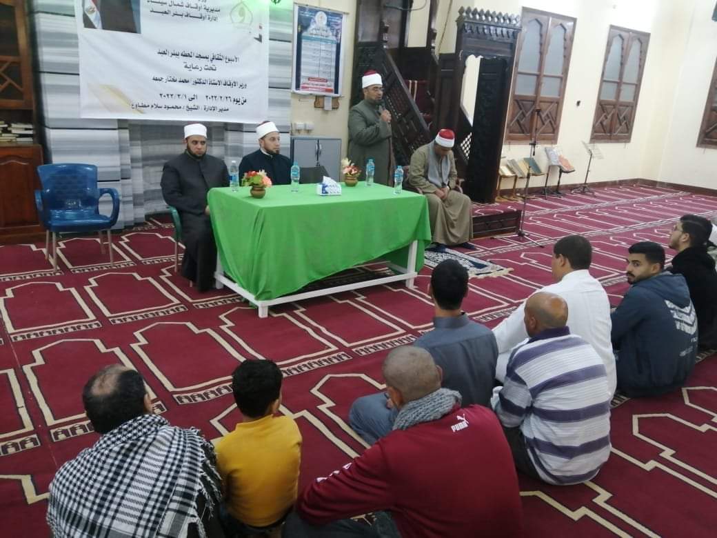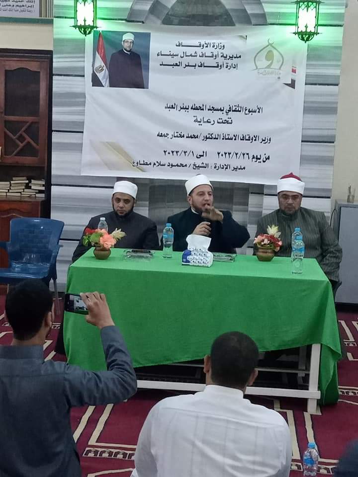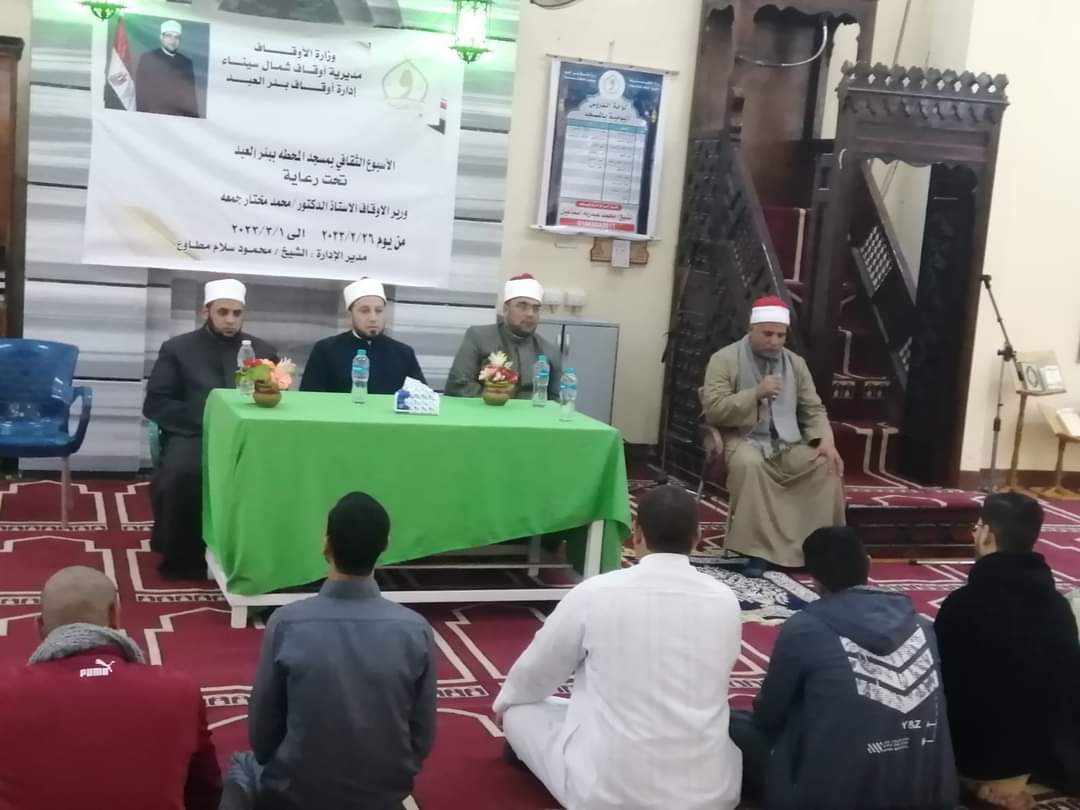 أعلنت مديرية الأوقاف بمحافظة شمال سيناء عن تواصل فعاليات نشاط الأسبوع الثقافي لليوم الثاني على التوالي بمسجد المحطة بمدينة بئر العبد.