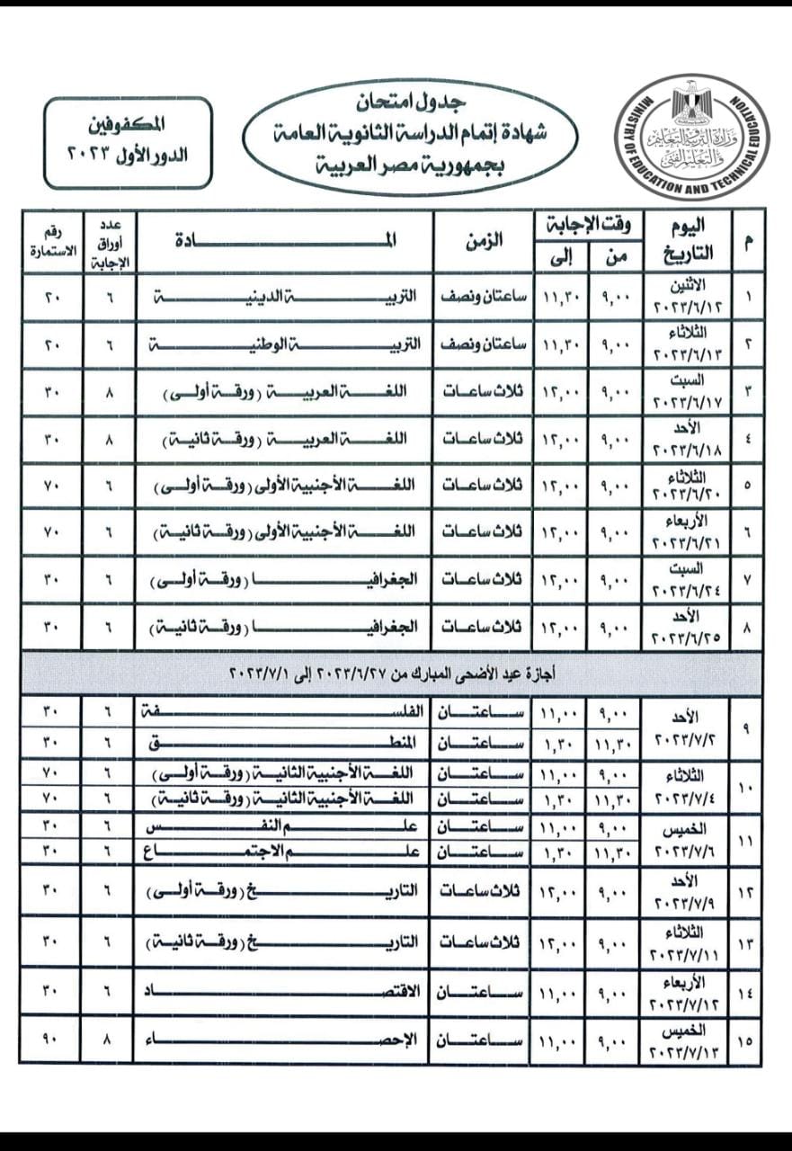 جدول امتحانات الثانوية العامة 2023 المكفوفين
