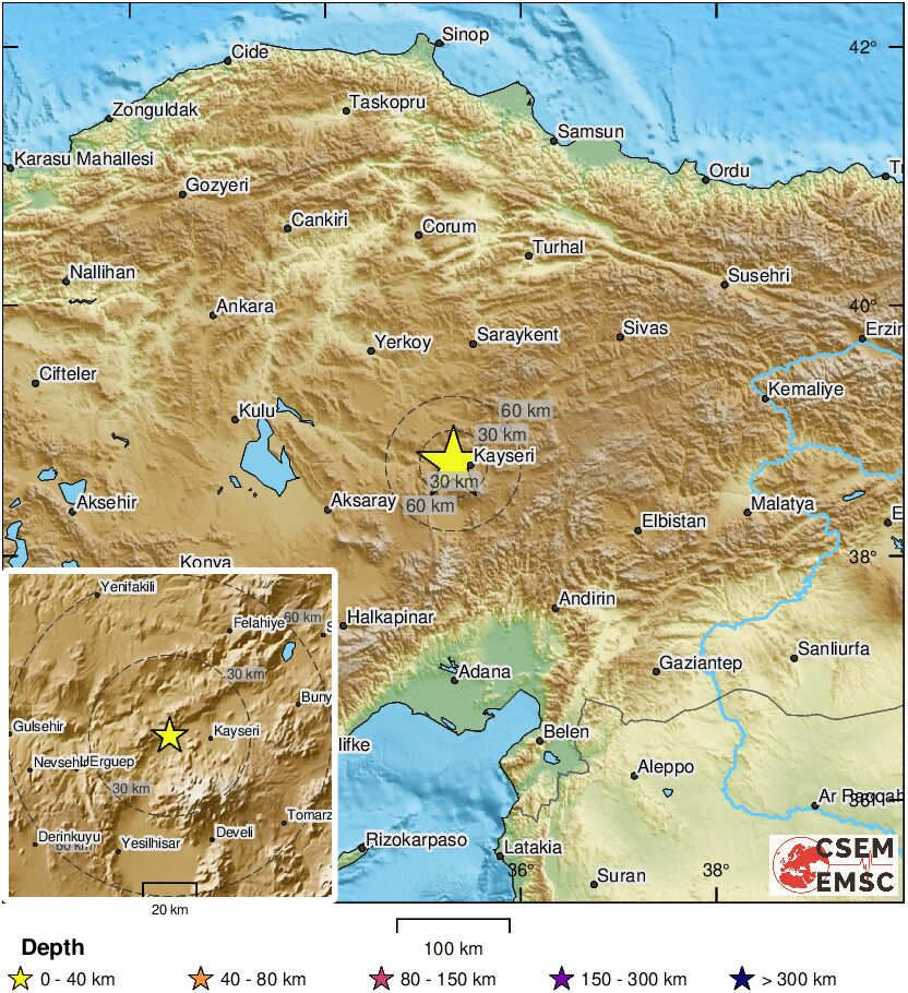 وأوضح المرصد في تحديث له أن الهزة الأرضية وقعت على بعد 15 كيلو متر غرب مدينة قيصري غرب تركيا.