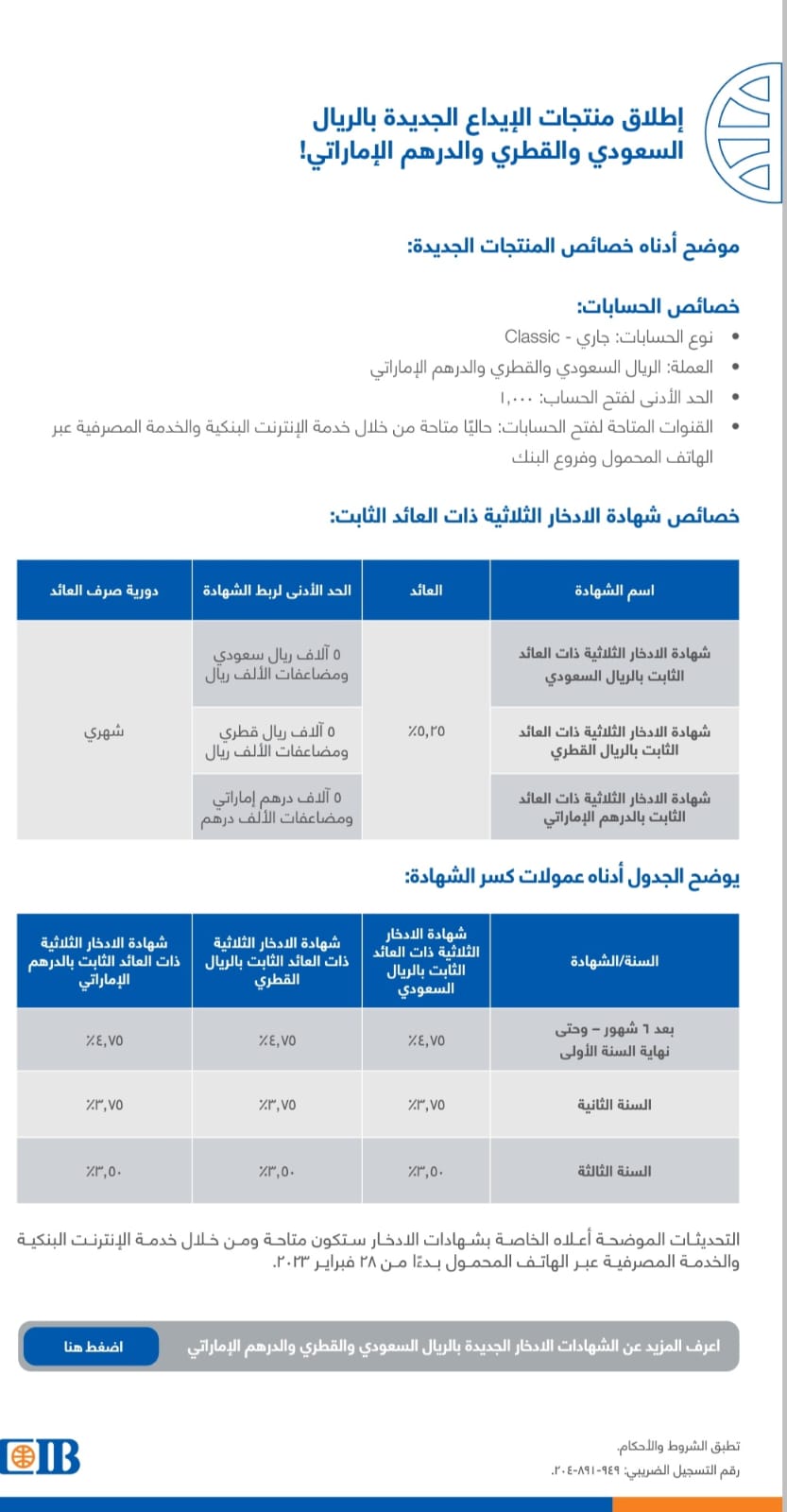 أعلن البنك التجاري الدولي CIB عن إطلاق منتج جديد بالريال السعودي والقطري والدرهم الإماراتي التي تشمل حسابات جارية – Classic وشهادات ادخار جديدة ذات الـ 3 سنوات بعائد شهري ثابت 5.25% يصرف شهريًا.