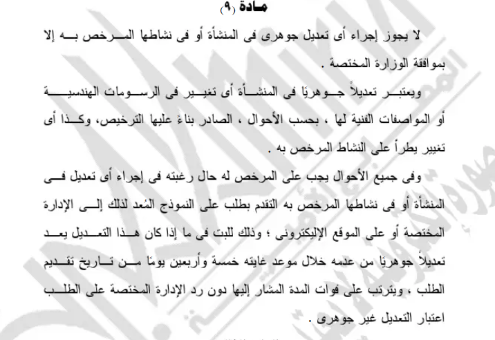 ونص القانون سالف الذكر، أنه يعتبر تعديلا جوهريا في المنشأة، أي تغيير في الرسومات الهندسية أو المواصفات الفنية لها، بحسب الأحوال الصادر بناءً عليها الترخيص، وكذلك أي تغيير يطرأ على النشاط المرخص به وفي جميع الأحوال يجب على المرخص له حال رغبته في إجراء أي تعديل في المنشأة أو في نشاطها المرخص به التقدم بطلب على النموذج المعد لذلك إلى الإدارة المختصة أو على الموقع الإليكتروني؛ وذلك للبت في ما إذا كان هذا التعديل يعد تعديلا جوهريا من عدمه خلال موعد غايته 45 يوما من تاريخ تقديم الطلب، ويترتب على فوات المدة المشار إليها دون رد الإدارة المختصة على الطلب اعتبار التعديل غير جوهري.